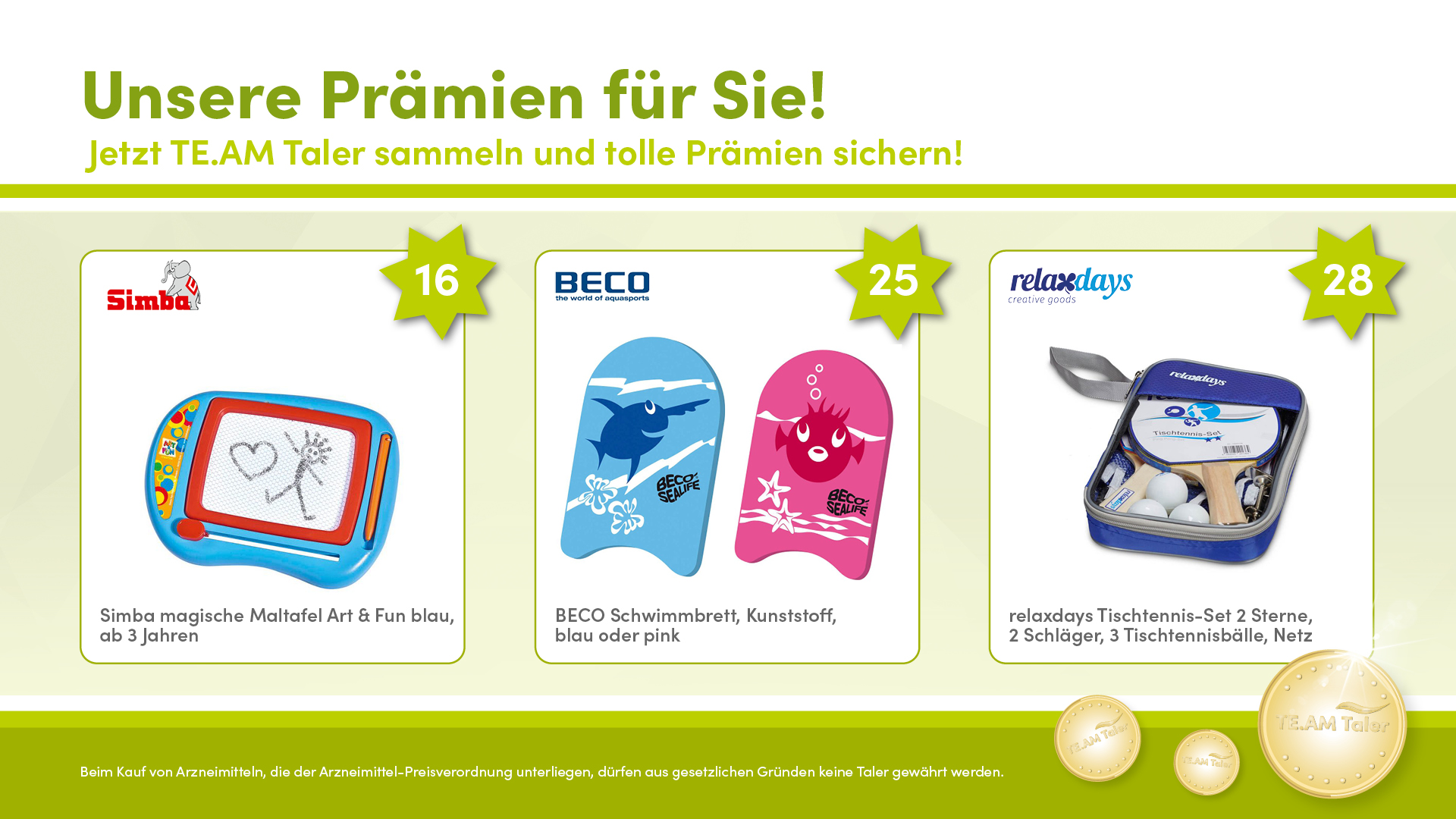 TE.AM Taler sammeln lohnt sich! Unsere TE.AM Apotheken Kundenkarte bietet Ihnen attraktive Vorteile: Sparen Sie bares Geld oder sichern Sie sich schöne Prämien!